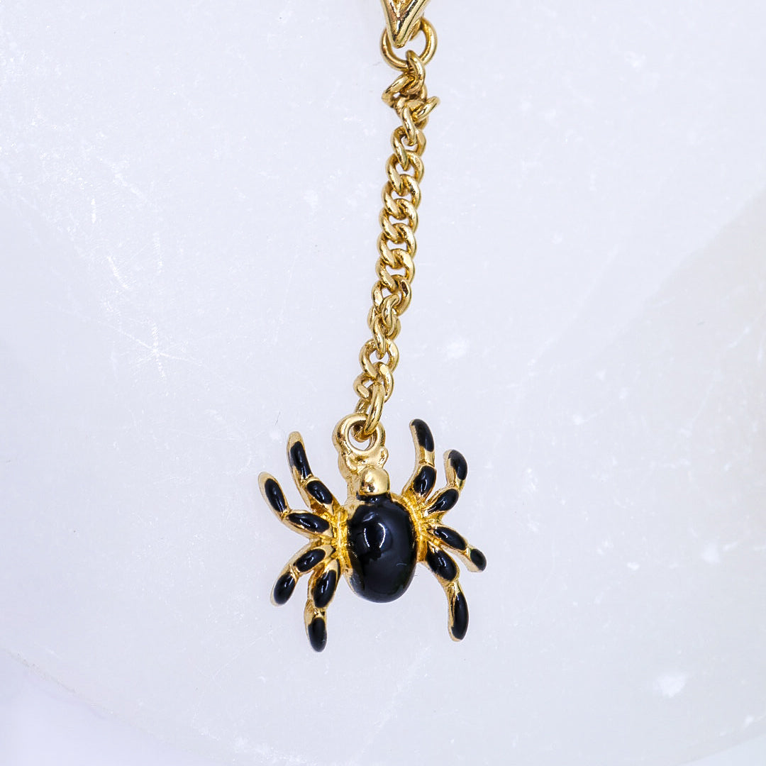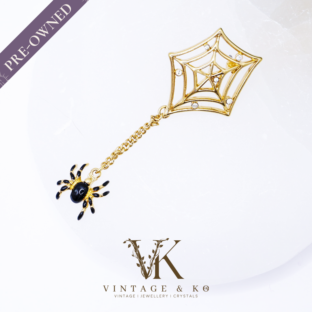 Gold-plated spider web brooch with small clear stones & spider dangling from chain