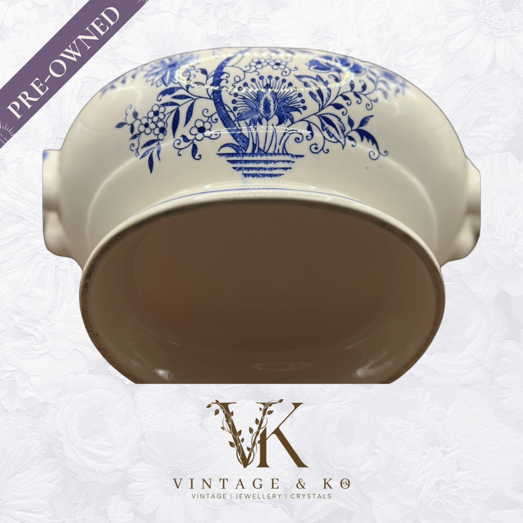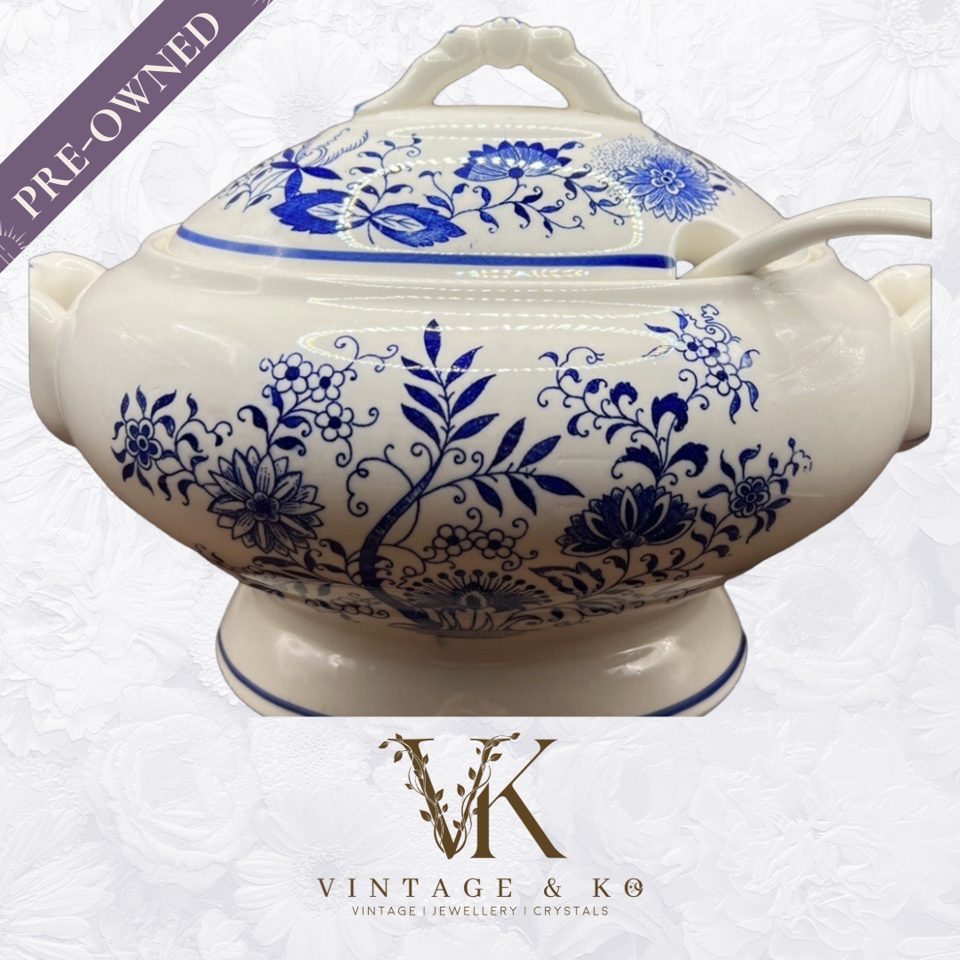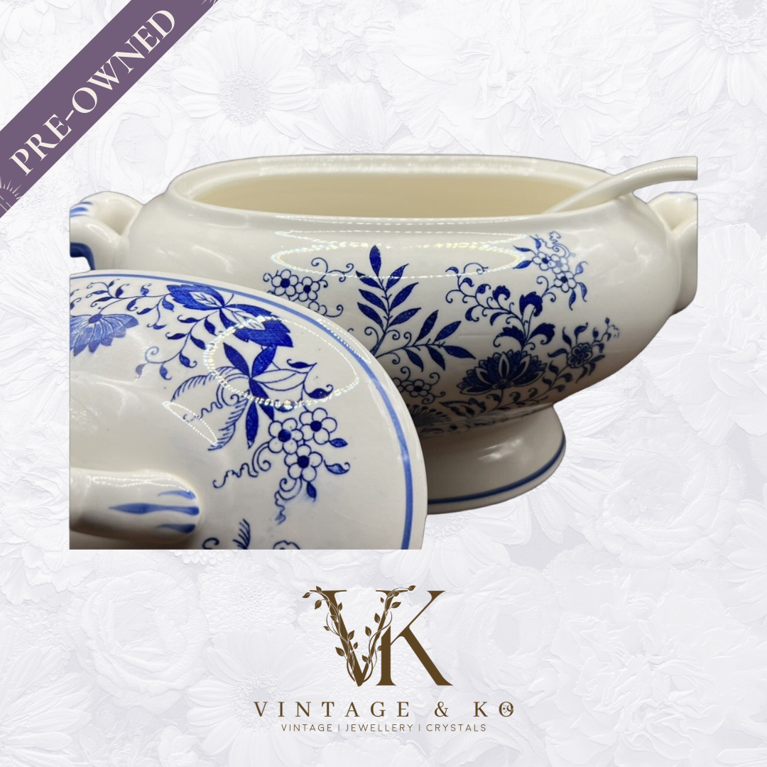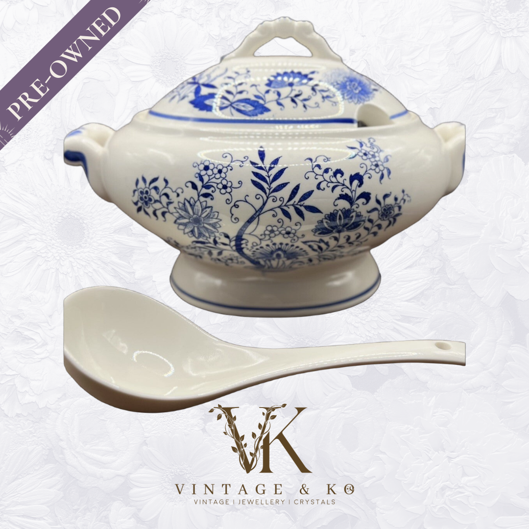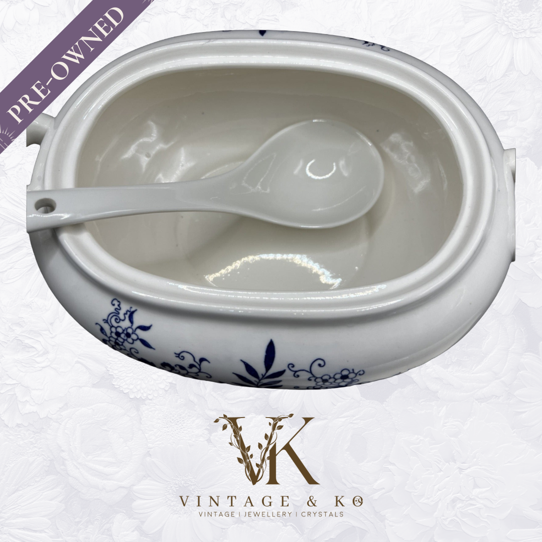 Vintage Floral Tureen Japanese Yanodento Glazed Blue & White with Large Ladle